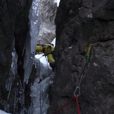 Materiale necessario: viti da ghiaccio (anche corte), friend medio piccoli per 4° e 6° tiro, qualche chiodo da roccia.