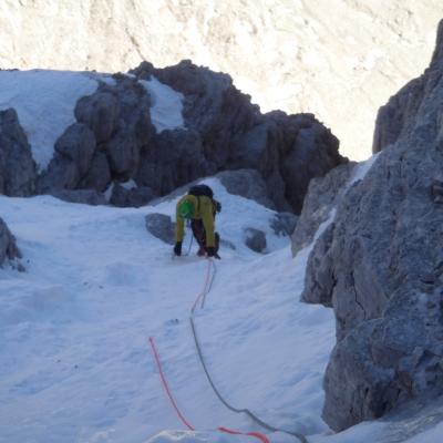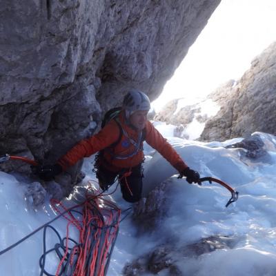 Risalire il risalto roccioso fino a superare il passaggio verticale con l'aiuto di un piccolo lenzuolo di ghiaccio. Seguire il canale nevoso andando a sostare a sx su roccia. |
