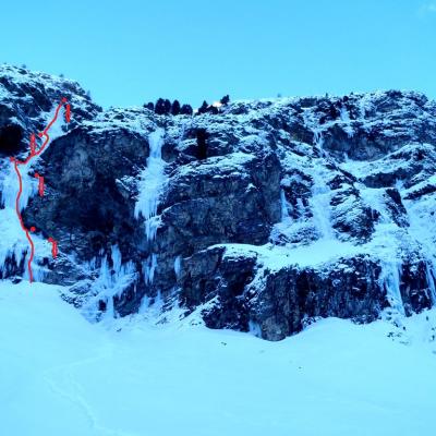 Di ritorno passiamo sotto Pattinaggio Artistico per vedere come è messa la partenza diretta, un crollo di ghiaccio è disseminato sul pendio, una netto taglio marca la candela di sinistra e una cascata di acqua sgorga dalla ferita, osserviamo la linea centrale ma bisognerebbe salire sulla candela sospesa per parecchi metri, quindi valutiamo più sicuro provare la linea di destra, si deve stare per poco sotto la candela, ma poi si è protetti sotto lo strapiombo e le frange si evitano a destra. La sera mangiando una pizza al Bar Licone leggeremo sul libro che l'attacco diretto di sx è stato salito con una profonda spaccatura....